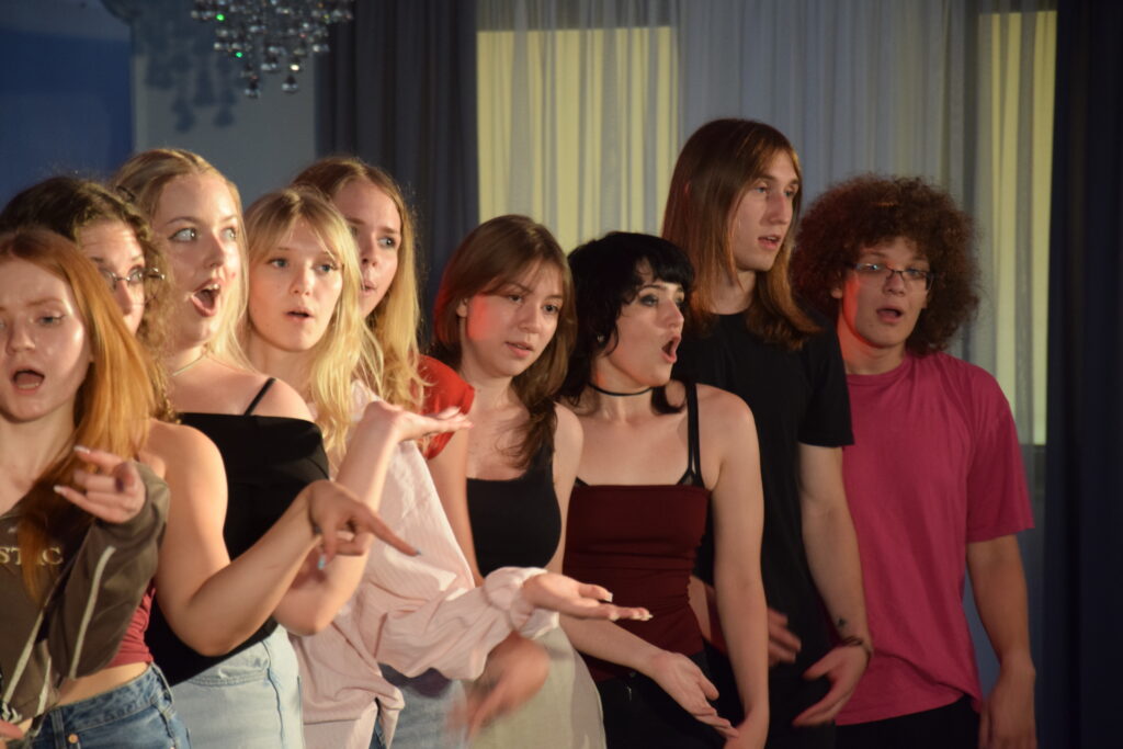 Na początek dobra informacja bo u nas nie ma budzików:))) wszyscy sami dbają o punktualność. Dzień zaczynamy śniadaniem o godz. 9.00. Potem rozgadanka, rozśpiewanka i zajęcia do obiadu czyli do godz.14.00 z 10 minutowymi przerwami. Uczestnicy podzielenie są na trzy grupy wiekowe. Każda grupa ma zajęcia grupowe: wokalne, taneczne i teatralne. Prowadzimy także zajęcia wokalne w mniejszych grupach przygotowując specjalne piosenki. Wszystkie zajęcia kończą się prezentacją w czasie koncertu finałowego.